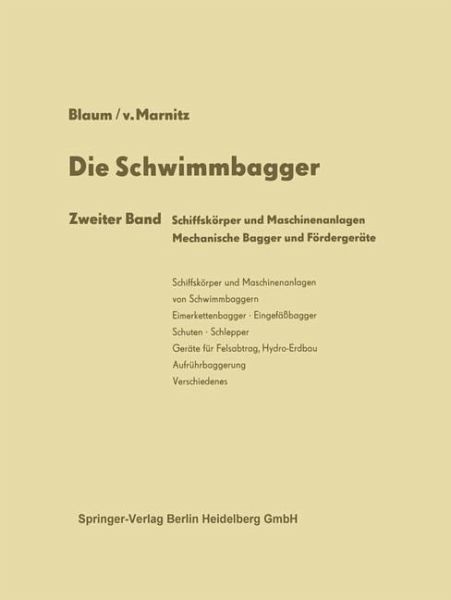 zu Band II.- Schiffskörper von Schwimmbaggern und Baggergeräten.- Maschinenanlagen auf Schwimmbaggern.- Eimerkettenbagger. Allgemeines.- Ausführungsbeispiele von Eimerkettenbaggern, Elevatoren.- Eingefäßbagger.- Schuten.- Propulsion, Schlepper und Schleppbetrieb.- Geräte für Felsabtrag unter Wasser, Aufrührbaggerung und Hydro-Erdbau.- Schlußkapitel.