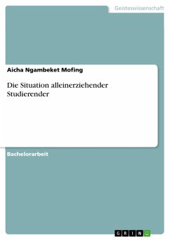 Bachelorarbeit aus dem Jahr 2013 im Fachbereich Soziologie - Soziales System und Sozialstruktur, Note: 2,0, Hochschule RheinMain, Sprache: Deutsch, Abstract: Alleinerziehende stellen eine stetig wachsende Gruppe in der Gesellschaft dar. Ihre Anerkennung als Familienform hat sich progressiv entwickelt. Heutzutage geht es prinzipiell nicht mehr darum, ob diese Gruppe als Familienform akzeptiert wird, sondern darum, die Lebensumstände der Angehörigen dieser Familienform zu verbessern. Da sowohl die Gründe des Alleinseins als auch die soziale Zugehörigkeit von Alleinerziehenden verschieden sind, wäre es ein Fehler, die Probleme zu generalisieren ohne Berücksichtigung der spezifischen Lebensumstände. Ziel dieser Arbeit ist daher die Analyse der Lebensumstände von alleinerziehenden Studenten und die Suche nach Möglichkeiten, wie diese Lebensumstände in Bezug auf ihren Status als Studierende verbessert werden können. Dieses Ziel setzt die Analyse der Lebensumstände von Alleinerziehenden in Deutschland allgemein voraus. Wie sehen die statistischen Daten von Alleinerziehenden in Deutschland aus? Mit welchen Schwierigkeiten haben sie zu kämpfen? Welche Ressourcen stehen ihnen zur Verfügung? Antworten auf diese Fragen repräsentieren allgemeine Kenntnisse und Wege zur Analyse der Zielgruppe der alleinerziehenden Studierenden. Die Ergebnisse dieser Studie sollen einen Beitrag leisten zur Erleichterung von Leben und Studium alleinerziehender Studierender.