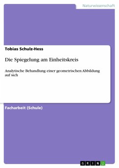 Facharbeit (Schule) aus dem Jahr 1992 im Fachbereich Mathematik - Geometrie, Note: 1.0, , Veranstaltung: Leistungskurs Mathematik I, Sprache: Deutsch, Abstract: Die Formelsammlung gibt über "Spiegelung am Einheitskreis" wie folgt Auskunft: Original und Bildpunkt haben das gleiche Argument: ihre Beträge sind zueinander reziprok. Die Abbildung bildet jeden Kreis k der durch den Punkt 8 ergänzten Gaußschen Ebene auf einen Kreis k' ab. Enthält k den Punkt z=0, so geht k' durch w=8 und umgekehrt. Um diese drei Sätze besser verstehen zu können, müssen einige Erläuterungen gegeben werden.