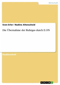 Studienarbeit aus dem Jahr 2004 im Fachbereich BWL - Unternehmensführung, Management, Organisation, Note: 1,7, Hochschule Bochum, Veranstaltung: Strategische Unternehmensführung, Sprache: Deutsch, Abstract: Die vorliegende Seminararbeit befasst sich mit der Übernahme der Ruhrgas AG durch E.ON. Hierbei handelt es sich um eine freundliche Übernahme, denn das Management des übernommenen Unternehmens Ruhrgas erklärt sich mit der Transaktion einverstanden. Dies liegt nicht zuletzt am Engagement von Dr. Klaus Liesen. 1 Dieser konzipierte schon die Aktionärsstruktur der Ruhrgas AG und ist jetzt Mitglied des Aufsichtsrats der E.ON AG und Vorsitze nder des Aufsichtsrats der Ruhrgas AG. Auch bei E.ON - Vorläufer VEBA war Liesen bereits im Aufsichtsrat vertreten. Die Kosten für die Ruhrgas AG betrugen im Ende 11,2 Mrd. EUR. Trotz der Hindernisse, die E.ON im Laufe der Zeit beseitigen musste, ist dies immer noch ein "Schnäppchen" für die E.ON AG. Nichts desto trotz ist diese Übernahme ein entscheidender Schritt in der Energiewirtschaft Deutschlands und Europas. Die Konkurrenz und der Wettbewerb werden dadurch weiter belebt. Im zweiten Kapitel stellen die Verfasser die beiden an der Übernahme beteiligten Unternehmen vor. Zunächst wird auf die Situation der E.ON AG vor der Übernahme eingegangen. An dieser Stelle wird auf die Ausführungen, wie das Unternehmen entstanden ist verzichtet, da sich eine andere Seminararbeit bereits ausführlich mit diesem Thema befasst hat. Das Unternehmen wird kurz vorgestellt im Hinblick auf Tätigkeitsfelder, wichtige Zahlen, Aktionärsstruktur, Beteiligungen, strategische Ausrichtung und Ziele und Marktposition. Im Folgenden wird Ruhrgas vor der Übernahme dargestellt. Zunächst werden die Tätigkeitsfelder und die historische Entwicklung aufgezeigt. Ein kurzer Exkurs soll die Lieferkette in der deutschen Gaswirtschaft deutlich machen. Die Marktposition der Ruhrgas AG und die Stufen der Wertschöpfungskette (Einkauf, Verkauf, Transport), auf denen Ruhrgas tätig ist werden ebenso beleuchtet wie die Beteiligungsstruktur und der Aktionärskreis der Ruhrgas AG.