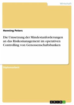 Diplomarbeit aus dem Jahr 2007 im Fachbereich BWL - Bank, Börse, Versicherung, Note: 2,3, AKAD-Fachhochschule Pinneberg (ehem. Rendsburg), Sprache: Deutsch, Abstract: Kreditinstitute unterliegen zahlreichen regulatorischen Anforderungen. Dazu zählen sowohl Gesetze wie das Kreditwesengesetz als auch zahlreiche aufsichtsrechtliche Regularien wie die so genannte M-Reihe, die zu den MaRisk (Mindestanforderungen an das Risikomanagement) zusammengefasst wurde. Die Umsetzung neuer und geänderter Regularien erfordert oftmals nicht nur organisatorische Änderungen, auch neue Technik im Bereich der Datenverarbeitung ist erforderlich, um den Anforderungen nachkommen zu können. Ziel der Arbeit ist es, durch einen Vergleich der Ist-Situation mit den aufsichtsrechtlichen Anforderungen den Handlungsbedarf herauszustellen, um die MaRisk im operativen Controlling umsetzen zu können. Bei Genossenschaftsbanken handelt es sich in der Regel um Nichthandelsinstitute, so dass diese vordergründig betrachtet werden. Durch Öffnungsklauseln in den MaRisk bieten sich bereits hier umfassende Möglichkeiten der Umsetzung. Der Schwerpunkt der Arbeit liegt in der Ermittlung der notwendigen Schritte, um eine Umsetzung im operativen Controlling durchführen zu können. Eine zusammenhängende Betrachtung bedingt dabei auch, dass auf weitere Aspekte wie z.B. die Organisation eingegangen wird. Im weiteren Verlauf sollen Möglichkeiten erarbeitet werden, wie ein Berichtssystem aussehen kann und welchen Umgang ein Kreditinstitut mit den Ergebnissen finden kann. Auch wenn der Fokus auf den MaRisk liegt, sollen weitere gesetzliche und aufsichtsrechtliche Anforderungen nicht unberücksichtigt bleiben, sofern sie dem Untersuchungsgegenstand dieser Arbeit dienlich sind.