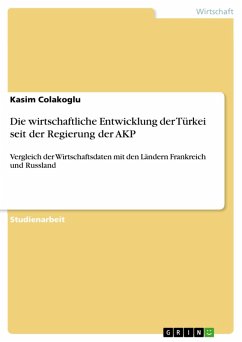 Studienarbeit aus dem Jahr 2013 im Fachbereich BWL - Wirtschaftspolitik, Note: 2,0, Fachhochschule Worms , Sprache: Deutsch, Abstract: Ziel dieser Arbeit ist es, die wirtschaftliche Situation der Türkei vor und während der Regierungszeit der AK-Partei anhand von verschiedenen Parametern zu erörtern. Desweiteren wird ein Vergleich zu Russland gemacht, welches ein Nachbarstaat ist, und zu Frankreich gemacht, welches ein europäisches verhältnismäßiges Land nach Einwohnerzahl und Größe ist.
