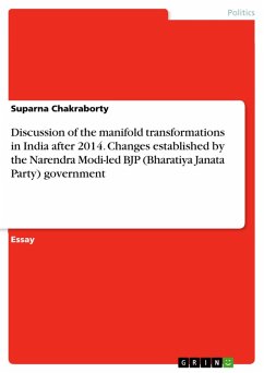 Essay from the year 2020 in the subject Political Science, grade: 2,0, University of Göttingen (Centre for Modern Indian Studies), course: Modern Indian Studies I: State and Society, language: English, abstract: I will discuss in this paper, the transformation of India after 2014 and how democracy suffers. In the contemporary scenario, the 2014 election in India was a welcoming year for militant Hinduism and extreme nationalism when BJP (Bharatiya Janata Party) came into power with 282 seats. A few incidents also took place regarding the harassment of democratic rights in the period during the UPA (United Progressive Alliance) government but things have changed drastically after the arrival of the NDA (National Democratic Alliance) government in India. It attacked the fundamental rights of people. The present government has started interrupting every aspect of people's life. No one can decide what someone will keep for a meal in his or her refrigerator. The choice of food has been threatened. India has transformed a lot through the post-independence period to till date especially when Hindu nationalist party like BJP came into power.