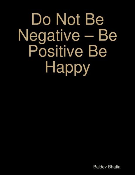 ABOUT THE BOOK Do Not Be Negative -Be Positive Be Happy is very unique book specially written for those who are very negative shaky and week in their character and who always intend to live a negative life. It is said that negative thinking is purely our own matter. Though it has got something to do with our external circum-stances. But there are certainly some positive factors within us that keep us happy and there is something negative within us also which keep us unhappy. Happy living through positive and good thoughts, is nothing more than that of living a normal life free from undue pressures, problems and tensions. The art of sweet living is not a complicated kind of art difficult to learn rather a simple art of happy living feeling well, eating well. And thinking well. What we need to do is just to tune up our mind to enjoy every moment of life and let the sweet happiness follow us.
