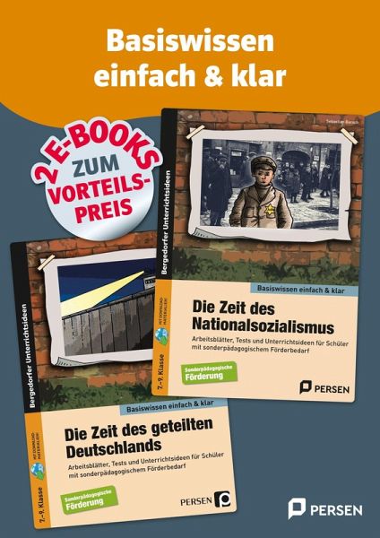 Zwei E-Books zum Vorteilspreis: So vermitteln Sie die Geschichte Deutschlands einfach, konkret und anschaulich! Mit dem Kauf dieses Bundles erhalten Sie die Inhalte von gleich zwei E-Books: Die Zeit des Nationalsozialismus - einfach & klar In diesem Band finden Sie motivierende Materialien rund um das Thema "Die Zeit des Nationalsozialismus". Inhaltliche Schwerpunkte Arbeitsmaterialien und Tests rund um das Thema "Die Zeit des Nationalsozialismus" Einstellungen und Vorurteile Der Nationalsozialismus Verbrechen in der Zeit des Nationalsozialismus Der Nationalsozialismus und der Zweite Weltkrieg Der Nationalsozialismus in der Gegenwart Anregungen und Material zu begleitenden handlungsorientierten Unterrichtsaktivitäten Zeit des geteilten Deutschlands - einfach & klar In diesem Band finden Sie motivierende Materialien rund um das Thema "Die Zeit des geteilten Deutschlands". Inhaltliche Schwerpunkte Arbeitsblätter - Tests und Unterrichtsmaterialien zum Thema "Die Zeit des geteilten Deutschlands" Deutschland von 1945-1949 Die Bundesrepublik Deutschland von 1949-1990 Die Deutsche Demokratische Republik von 1949-1990 Anregungen und Material zu begleitenden handlungsorientierten Unterrichtsaktivitäten Ein Bundle um Basiswissen einfach und klar vermitteln. Abstrakte Zusammenhänge sind speziell für Schüler mit sonderpädagogischem Förderbedarf einfach, konkret und anschaulich aufbereitet. Ideen und Materialien zu begleitenden handlungsorientierten Unterrichtsaktivitäten zur weiteren Veranschaulichung und Festigung runden das Paket ab! Um den Lernfortschritt überprüfen zu können, werden außerdem Tests zu den einzelnen Themenbereichen angeboten. Besonders praktisch: Im Zusatzmaterial finden Sie die Arbeitsblätter und Tests im veränderbaren Word-Format sowie Lösungen zur Selbstkontrolle!