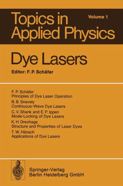 VI spectrum of potential applications is outlined by T. W. HANSCH, who also touches briefly on the exciting field of laser spectroscopy, a most important application to which a forthcoming volume is devoted. The treatment, being tutorial in nature, is suitable both for graduate students and for scientists working in the dye-laser field or applying a dye laser in another research discipline. The book will also prove to be an indispensable and handy source of information for the specialist. The literature is reviewed up to spring 1973, and the list of additional references (which cites the titles of articles) extends to summer 1973. This is proof of an amazingly short publication period for a 300-page book. Heidelberg, October 1973 HELMUT K. V. LOTSCH Contents 1. Principles of Dye Laser Operation. By FRITZ P. SCHAFER (with 53 Figures) Historical . . . . . . . . . . . . . . . . 1 Organization of the Book . . . . . . . . . 5 1. 1. General Properties of Organic Compounds 6 1. 2. Light Absorption by Organic Dyes 9 1. 3. Deactivation Pathways for Excited Molecules 28 1. 4. Laser-Pumped Dye Lasers . . . . . . 32 1. 4. 1. Oscillation Condition . . . . . 32 1. 4. 2. Practical Pumping Arrangements 37 1. 4. 3. Time Behavior and Spectra 44 1. 5. Flashlamp-Pumped Dye Lasers 54 1. 5. 1. Triplet Influence . . . . 54 1. 5. 2. Practical Pumping Arrangements 60 1. 5. 3. Time Behavior and Spectra 64 1. 6. Wavelength-Selective Resonators for Dye Lasers 66 1. 7. Dye-Laser Amplifiers 79 1. 8. Outlook . . . . . . . . . . . . . . . . . 83 2. Continuous-Wave Dye Lasers. By B. B.