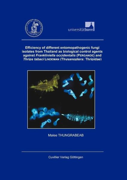 The present research aimed to study efficiency of 41 isolates of entomopathogenic fungi, belonging to 25 species from 11 genera isolated from different hosts in Thailand, as biological control agents against Frankliniella occidentalis (PERGANDE) and Thrips tabaci LINDEMAN (Thys., Thripidae). Firstly, the efficiency isolates was screened in the laboratory for the following characteristics: pathogenicity, virulence degree and effectiveness. In further experiments, the isolates that displayed highly efficient were subjected to studies biological and ecological characteristics, mode of infection, their efficiency under abiotic and biotic factors as well as side effects on non-target arthropods. Finally, persistence on different host plants and efficiency for controlling thrips under greenhouse conditions were investigated. In the laboratory, the results showed that 37 isolates for F. occidentalis and 36 isolates for T. tabaci were found to be pathogenic. The 16 isolates were highly pathogenic. Fungi isolates varied significantly in term of virulence. Five isolates were superior to all other isolates according to the virulence degree. The efficiency against all stages of both thrips species showed that the susceptibility decreased from larvae over pupae to adults. Beauveria bassiana Bb.5335 and Metarhizium anisopliae Ma.7965 displayed the highest efficacy throughout the following series of screenings and were used for further experimentation. Biological characteristics of B. bassiana and M. anisopliae were dependent on environmental factors but they did not greatly affect. The process involving pathogenicity on thrips began from 12 h and was completed within 72 h after inoculation. However, temperature and life stage of thrips were found to have effects on the development of pathogenicity process. The efficacy of the two fungi was higher at 25 and 30°C than at 18 and 35°C. Those increased with increasing relative humidity and varied according to the host plant whether on crop or ornamental plants. Both thrips species reared on cucumber were highly susceptible to fungal infection but significantly less susceptible when reared on saintpaulia. B. bassiana and M. anisopliae had low side effects on non-target beneficial arthropods.