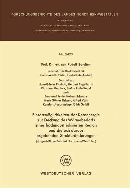 Die energiewirtschaftliche Situation des Landes NRW und die Abschätzung des zukünftigen Energiebedarfs.- Einsatzmöglichkeiten der Kernenergie (speziell des HTR's).- Betriebswirtschaftliche Untersuchungen.- Regionalwirtschaftliche Untersuchungen.- Umweltbelastungsminderung durch den HTR-Einsatz (aufgezeigt an zwei Beispielen).- Ausblick auf neuere systemtechnische Methoden zur Analyse der energiewirtschaftlichen Entwicklung des Landes NRW.