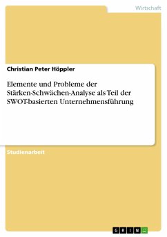 Studienarbeit aus dem Jahr 2012 im Fachbereich BWL - Unternehmensführung, Management, Organisation, Note: Sehr gut (14 Pkt.), Fachhochschule des Bundes für öffentliche Verwaltung - Fachbereich Arbeitsverwaltung und Bundeswehrverwaltung Mannheim, Sprache: Deutsch, Abstract: Die vorliegende Arbeit soll in einem ersten Schritt den Zusammenhang zwischen Unternehmensführung und strategischer Unternehmensplanung darstellen. Im Anschluss werden die zwei Kernelemente sowie die grundsätzliche Funktionsweise der SWOT-Analyse als ein Instrument der strategischen Unternehmensplanung vorgestellt. Nachdem die Kernelemente als Chancen-Risiken-Analyse und als Stärken-Schwächen-Analyse identifiziert sind, bildet die differenzierte Betrachtung der internen Sphäre den Schwerpunkt dieser Arbeit. Hierbei werden die Elemente der Stärken- und Schwächen-Analyse beschrieben sowie Probleme aufgezeigt, die während ihrer Anwendung auftreten können.