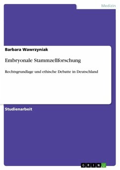 Studienarbeit aus dem Jahr 2006 im Fachbereich Medizin - Sonstiges, Note: 1,0, Heinrich-Heine-Universität Düsseldorf, Veranstaltung: Aktuelle Fragen der Bioethik, Sprache: Deutsch, Abstract: Embryonale Stammzellforschung ist ein umstrittenes und heiß diskutiertes Thema. Ob auf dem politischen Parkett oder im philosophischen Kontext, einen Konsens mit allen argumentierenden Parteien zu finden scheint unmöglich zu sein. Zu sehr gehen die Meinungen über den moralischen Status des Embryos auseinander: Würde und damit Lebensschutz oder Forschungsgegenstand und damit neue Heilungschancen? Erst kürzlich erlangte das Thema wieder Brisanz als Präsident George W. Bush sein Veto gegen ein neues Gesetz zur Stammzellforschung, die mit Bundesmitteln vorangetrieben werden sollte, einlegte. Während sich der amerikanische Präsident den heilvollen Versprechen der embryonalen Stammzellforschung entzieht, sichert das Europäische Parlament dieser Forschungsrichtung 50 Millionen Euro zu. Gespalten sind die Reaktionen in Deutschland, wo die embryonale Stammzellforschung verboten ist. Wie genau die rechtliche Lage des Embryos hierzulande aussieht, ist Teil dieser Hausarbeit. Ein kurzer Vergleich über die rechtliche Lage in anderen Ländern, soll Aufschluss darüber geben, wie andere Nationen mit diesem heiklen Thema umgehen. Darüber hinaus soll ein kurzer Einblick in die medizinischen Vorteile gegeben werden, die sich gegenüber den adulten Stammzellen ergeben und welche Heilungschancen damit in Verbindung stehen könnten. Im Anschluss wird auf die bioethische Debatte in Deutschland eingegangen, die für die Rechtssetzung eine relevante Rolle spielt. Begriffe wie Würde, Person und Lebensrecht sind nur einige Schlagwörter, die diesen bioethischen Diskurs bestimmen. Insbesondere die SKIP-Argumente, die für einen Schutz des Embryos stehen, sollen hier näher erläutert werden. Allerdings ist es nicht möglich einen gesamten und uneingeschränkten Überblick über die Diskussion der embryonalen Stammzellforschung zu geben, da dieses Vorhaben das Maß einer Hausarbeit weit überschreiten würde. Eine gute Grundlage für die ethische Auseinandersetzung mit dem moralischen Status menschlicher Embryonen bietet der Sammelband von DAMSCHEN und SCHÖNECKER (2002). Mit einer ausführlichen Darstellung der Hauptargumente in dieser Debatte, bietet der Band einen übersichtlichen Einstieg in diese Thematik. Ebenso empfehlenswert ist MERKELs (2002a) Arbeit zu dieser Materie, die nicht nur in die ethische Diskussion einführt, sondern auch ausführlich auf rechtliche Belange eingeht. Darüber hinaus bietet das Internet zahlreiche Möglichkeiten sich über Kommissionen und aktuelle Standpunkte zu informieren.