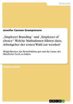 Studienarbeit aus dem Jahr 2014 im Fachbereich Führung und Personal - Employer Branding, Note: 1,0, , Sprache: Deutsch, Abstract: Diese Seminararbeit befasst sich mit der Beantwortung der Fallfrage: "Internes "Employer Branding" der "Employer of choice" bleiben! Möglichkeiten, das Betriebsklima gut und die Laune der Mitarbeiter hoch zu halten, dargestellt an praktischen Beispielen". Heutzutage kann ein Unternehmen mit positiven Arbeitgebereigenschaften naturgemäß leichter Mitarbeiter an sich binden. Besonders in Zeiten des viel beschworenen Fachkräftemangels, dessen Höhepunkt laut Experten noch nicht erreicht ist, eine unabdingbare Fähigkeit. Mittlerweile gehören jedoch vor allem qualifizierte Mitarbeiter zu den wichtigsten Ressourcen der Unternehmen. Für die Unternehmen gilt es, sich im sogenannten "War for Talents" an die richtige Position zu stellen, um der Arbeitgeber der ersten Wahl zu werden. Es gilt nicht nur, neues Personal zu gewinnen, sondern vor allem das Bestandspersonal zu halten. Welche Maßnahmen führen dazu, Arbeitgeber der ersten Wahl zur werden? Diese Frage wird unter anderem an unterschiedlichen Beispielen mit Praxisbezug untersucht. Weiterer Inhalt dieser Untersuchung ist auch die Mitarbeiterbindung. Diese Betrachtungen beschränken sich dabei jedoch ausschließlich auf Unternehmen in Deutschland.