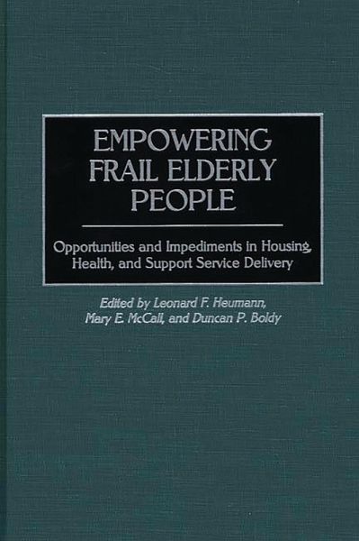 Introduction Empowerment: Definitions, Applications, Problems and Prospects by Mary E. McCall, Leonard F. Heumann, and Duncan P. Boldy Opportunities and Impediments in Housing, Health and Support Service Delivery by Leonard F. Heumann, Duncan P. Boldy and Mary E. McCall Service Providers and Empowerment: Information, Training and Coordination Promoting Empowerment in Residential Aged care: Seeking the Consumer View by Duncan P. Boldy and Linda E. Grenade Reimagining Senior Empowerment in Service Delivery: Creative Applications in a Global Context by Mary E. McCall Retaining and Expanding Empowerment in the Transition to a Community-Oriented Support System: Japan in the 21st Century by Tokie Anme Empowerment in Post-Reform Community Care in England and Wales by Bleddyn Davies Environment and Empowerment in Conventional Housing Another Way of Living in One's Own Home: The Salmon Group Projects by Robin Currie, Marie-Jo Guisset, and Niek de Boer The Role of the Built Environment in Holistic Delivery of Home and Community Based Care Services to Frail Elderly Persons by Leonard F. Heumann When Community Planning Becomes Community Building: Place-Based Activism and the Creation of Good Places to Grow Old by Philip B. Stafford Client Empowerment in Long-Term Care The Rights of Elderly People in a Nursing Home--A Little Creativity, a Lot of Respect, a Taste for Adventure and an Allergy to Burearcracy by Germain Harvey Bringing Managed Health Care Home: A New Service Strategy for People with Chronic Illnesses and Disabilities by Dennis L. Kodner, Meg Sherlock, and Jonathan Shankman Elderly Persons with Severe Mental Illness: Empowering a Neglected and Growing Population by Paul H. Carmichael Older People with Long Standing Disabilities and their Caregivers: Empowering a Neglected and Growing Population by Lindsay Gething Overview and the Future Empowerment in Pathways Through Care: A Cross-National Comparison of Care Delivery Systems in Britain and Germany by Michaela Schunk Empowerment of Frail Elderly People and the Vision of a Self-Actualized Society by Duncan P. Boldy, May E. McCall, and Leonard F. Heumann