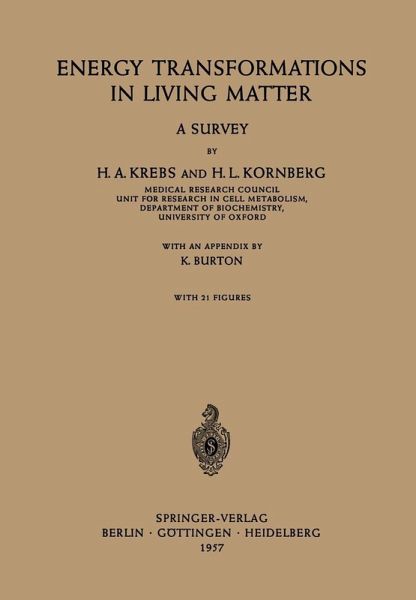 This survey was written at the invitation of the Editors of the "Ergebnisse der Physiologie". Its aim is to present the more recent progress in the know ledge of biological energy transformations. Since it was intended for a review journal, the reader was taken to be familiar with the fundamentals of current biochemistry, as described in the standard textbooks. It was not the object to compile an extensive collection of facts. The survey is limited to aspects of wider interest, and the main emphasis has been on the general unifying principles which emerge from the great mass of detailed ob servations. The article is reprinted in the hope that it may be useful in this form to advanced students and research workers in biochemistry and related subjects. H. A. KREBS H. L. KORNBERG 2 Table of Contents Page 1. The Key Position of Adenosine Triphosphate . . . 213 2. The Three Phases of Foodstuff Degradation. . . . 213 3. The Energy-Yielding Steps of Intermediary Metabolism 215 4. The Build-up of Phosphate Bond Energy ..... 221 5. Alternative Pathways of Anaerobic Fermentation in Micro-organisms. 227 6. Alternative Pathways of Glucose Oxidation . 237 7. The Path of Carbon in Photosynthesis . . . 243 8. Utilization of Energy for Chemical Syntheses 249 9. Control of Energy-Supplying Processes . . . 262 10. A Special Feature of ATP as an Energy Store. 271 11. Evolution of Energy Transforming Mechanisms 273 Appendix by K. BURTON Free Energy Data of Biological Interest 27S References . . . . . . . . . . . . . . .
