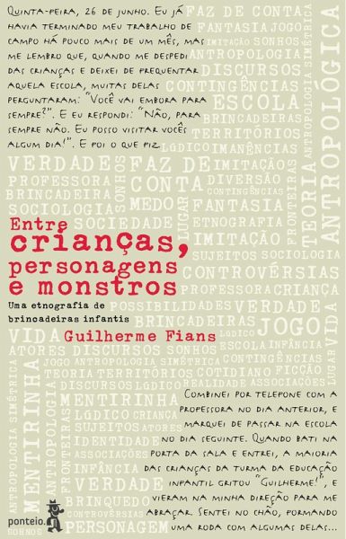 Entre crianças, personagens e monstros é o resultado de uma pesquisa de cunho etnográfico sobre jogos e brincadeiras infantis, feita com crianças da educação infantil e do primeiro segmento do ensino fundamental (de três a sete anos de idade), envolvendo ainda professores, direção da escola e, vez ou outra, pais de alunos. Tarefa ousada para um jovem antropólogo como Guilherme Fians. Os antropólogos clássicos e vitorianos, ao compararem a mentalidade primitiva com a mentalidade infantil, sugerem que, por não estarem cientes das leis da natureza, os povos primitivos explicam os acontecimentos por leis divinas, e, ao não conseguirem perceber as relações causais de forma clara, estariam se enganando. De forma similar, as crianças estariam se enganando ao acreditarem em monstros ou ao "acharem" que são super-heróis durante um faz de conta. Do mesmo modo, para etnografar as brincadeiras infantis, o autor não tem como evitar que a sua pesquisa esbarre, todo o tempo, na tradição ontológica arraigada nas noções do que é "de verdade" e do que é "de mentira", bem como nas regras instáveis das brincadeiras. Colocado de outra maneira, como escapar das distinções fáceis entre "mundo adulto" e "mundo infantil"? Ou o que é "sério" e o que é de "brincadeira"? Valendo-se de uma corrente antropológica contemporânea, denominada antropologia simétrica, Guilherme Fians vence com sobras os desafios ao levar realmente a sério os conceitos e práticas que as crianças formulam quando brincam. Ao levar as crianças a sério, o autor elabora uma antropologia que não é simplesmente "sobre a infância", mas "da infância", no sentido em que é escrita "do ponto de vista das crianças".