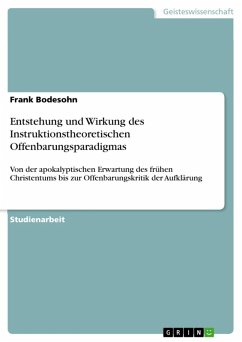 Studienarbeit aus dem Jahr 2006 im Fachbereich Theologie - Systematische Theologie, Note: 1,3, Universität des Saarlandes (Katholische Theologie), Veranstaltung: Einführung in die Fundamentaltheologie, Sprache: Deutsch, Abstract: Das Christentum war in seiner Geschichte und der seiner Glaubensdogmen einschneidenden Veränderungen unterworfen. Die Gründe dafür waren unterschiedlicher Art. Die jeweilige Glaubensmeinung der christlichen Theologie ist stark verknüpft mit dem Offenbarungsbegriff, der zur gleichen Zeit vorherrschend war. Ebenso war das Verständnis von Offenbarung bestimmend für die Sichtweise, in welchem Verhältnis der Mensch zu Gott steht. Gegen die jeweilige theologische Definition von Offenbarung wurden mehrmals in der Geschichte des Christentums innerhalb und außerhalb der Kirche Zweifel laut und ergänzende und entgegengesetzte Meinungen konstruiert. Die gravierendsten Änderungen erlebte der Offenbarungsbegriff um das 17. Jahrhundert, als sich viele Theologen und Philosophen mit dem Selbstverständnis des Christentums und seiner Legitimation beschäftigten.