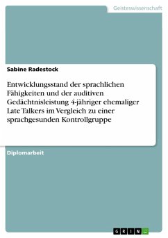Diplomarbeit aus dem Jahr 2011 im Fachbereich Psychologie - Entwicklungspsychologie, Ruprecht-Karls-Universität Heidelberg (Psychologisches Insitut), Sprache: Deutsch, Abstract: Sprache ist ein für den Menschen wichtiges Medium, um sich in der Gesellschaft zurechtzufinden und durchzusetzen, um zu lernen, sich zu entwickeln sowie um sich sozial und emotional mitzuteilen (Weinert, 2006). Der Prozess der Sprachentwicklung ist ein komplexer Vorgang, der überwiegend in den ersten Jahren der Kindheit stattfindet. Störungen der Sprachentwicklung gehören mit einer Prävalenzrate von 6-8% zu den häufigsten Problemen der kindlichen Entwicklung im Vorschulalter (Kühn, 2010). Die früher häufig praktizierte Wait-and-See-Strategie, die auf der Annahme basiert, dass der Rückstand von selbst aufgeholt wird, ist heutzutage wissenschaftlich nicht mehr vertretbar (Buschmann et al., 2008). In Anbetracht der weitreichenden und gravierenden Folgen einer Sprachentwicklungsstörung ist eine frühe Identifizierung der Risikokinder von immenser Bedeutung, um Maßnahmen zur Prävention oder zur Therapie einzuleiten. Heute machen es diagnostische Methoden möglich, die von einer stark verzögerten Sprachentwicklung gefährdeten Kinder in einem Alter von circa 2 Jahren zu erkennen. Für diese Kinder hat Frau Dr. Buschmann mit dem 2008 veröffentlichten Heidelberger Elterntraining (HET) eine elternzentrierte Frühintervention vorgestellt, deren kurz- und mittelfristige Effektivität bereits überprüft und bestätigt wurde (Buschmann, Jooss & Pietz, 2009). In dieser Arbeit wird nun die langfristige Effektivität des Heidelberger Elterntrainings untersucht. Dazu werden der Sprachentwicklungsstand ehemaliger Late Talkers, deren 2 1 Einleitung Eltern das HET besuchten (Interventionsgruppe), mit dem von Late Talkers ohne Intervention (Wartegruppe) im Alter von 4 Jahren untereinander und mit dem von sprachentwicklungsgesunden Kindern (Kontrollgruppe) verglichen. Sollte sich zeigen, dass das Sprachniveau der ehemaligen Late Talkers nach dem HET im Alter von 4 Jahren nicht von dem der Late Talkers, deren Eltern nicht am HET teilgenommen haben, unterscheidet, dann sollte über eine längere und intensivere Unterstützung dieser Kinder nachgedacht werden. Sollte aber der langfristige Erfolg des Heidelberger Elterntrainigs bestätigt werden, dann wäre dies eine klare Befürwortung für eine Frühintervention bei Sprachentwicklungsverzögerungen (im speziellen für das Heidelberger Elterntraining), die - bei entsprechender Befundlage - intensiviert angeboten und möglichst vielen betroffenen Kindern zugänglich gemacht werden sollte.
