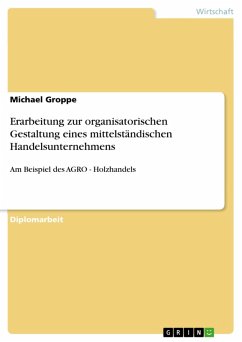 Diplomarbeit aus dem Jahr 2008 im Fachbereich Führung und Personal - Sonstiges, Note: 1,5, Berufsakademie Sachsen in Dresden (Holztechnik), Veranstaltung: BWL, Sprache: Deutsch, Abstract: GROPPE, Michael: Erarbeitung zur organisatorischen Gestaltung eines mittelständischen Handelsunternehmens am Beispiel des AGRO - Holzhandels, Berufsakademie Sachsen, Staatliche Studienakademie Dresden, Studienrichtung Holztechnik, Diplomarbeit 2008. 61 Seiten, 18 Literaturquellen, 29 Anlagen. Ziel der vorliegenden Arbeit ist die Erarbeitung einer organisatorischen Gestaltung eines mittelständischen Unternehmens - dem AGRO - Holzhandel. Grundlage für diese Erarbeitung stellen die wissenschaftlichen theoretischen Erkenntnisse und praxisorientierte Zusammenhänge zur Organisationsgestaltung dar. Die erarbeitete Organisation soll Betriebsabläufe und den Einsatz des Personals in diesem Handelsunternehmen effizienter gestalten. Zunächst werden wesentliche Grundbegriffe der modernen Organisationsgestaltung dargelegt und der organisatorische Zustand des Unternehmens untersucht. Zur Untersuchung des bestehenden organisatorischen Gefüges des AGRO - Holzhandels und zur Ermittlung relevanter Merkmale werden eine Mitarbeiterbefragung und ein Unternehmerinterview durchgeführt. Deren Auswertung soll die innerbetrieblichen Schwachstellen, Probleme und Verbesserungsvorschläge von Mitabeitern und dem Unternehmer aufzeigen. Abschließend wird aus den wissenschaftlichen Erkenntnissen und den ermittelten Daten ein Lösungsvorschlag zur organisatorischen Gestaltung entworfen und dessen Einführung in das Unternehmen untersucht.