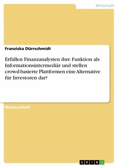 Masterarbeit aus dem Jahr 2018 im Fachbereich BWL - Rechnungswesen, Bilanzierung, Steuern, Note: 2,0, Universität Mannheim (Lehrstuhl für ABWL und Rechnungswesen), Sprache: Deutsch, Abstract: Finanzanalysten spielen eine wichtige Rolle als Informationsintermediär auf dem Kapitalmarkt, indem sie Informationen systematisieren, verarbeiten und anderen Kapitalmarktakteuren zur Verfügung stellen. Am Ende ihres Informationsverarbeitungsprozesses stehen sogenannte Research Reports, die unter anderem Ertragsprognosen und Aktienempfehlungen enthalten und die an ihre Kunden, wie beispielsweise institutionelle Investoren, verteilt werden. Eine kritische und unverzerrte Informationsverarbeitung dient potentiellen Investoren als wichtige Grundlage für ihre Anlageentscheidungen. Die Arbeit der Finanzanalysten unterliegt jedoch inhärenten Interessenkonflikten. Einerseits sollen sie im Dienste ihrer Kunden Unternehmen beurteilen und Empfehlungen abgeben. Andererseits müssen sie aber auch ein enges Verhältnis zum Management des beobachteten Unternehmens pflegen, um so an exklusive Informationen zu gelangen. Zudem dürfen sie in ihren Schätzungen und Empfehlungen auch den Interessen des eigenen Arbeitgebers nicht zuwiderlaufen. Diese Interessenkonflikte können zu Verzerrungen führen, die bereits in zahlreichen empirischen Studien nachgewiesen wurden. Resultierend aus den Problemen in Bezug auf die Prognoseverzerrungen der Finanzanalysten gründete der ehemalige Hedgefonds-Manager Leigh Drogen im Jahr 2011 die crowd-basierte Plattform Estimize.com, die es ihren Usern ermöglicht, Ertragsprognosen für Unternehmen abzugeben. In dieser Arbeit soll auf Basis dieser Behauptungen geprüft werden, ob Estimize gegenüber den Finanzanalysten eine echte Alternative als Informationsintermediär für Investoren darstellen kann. Dazu wird zunächst im zweiten Kapitel aus theoretischer Perspektive hergeleitet, warum Informationsintermediäre auf dem Kapitalmarkt auftreten, um auf dieser Basis deren ökonomische Funktionen abzuleiten. Im dritten Kapitel werden die Finanzanalysten als Informationsintermediäre am Kapitalmarkt näher betrachtet. Dabei steht insbesondere deren Funktionserfüllung als Informationsintermediäre auf dem Kapitalmarkt im Vordergrund. Im vierten Kapitel wird abschließend untersucht, ob die crowd-basierte Plattform Estimize eine echte Alternative für Finanzanalysten darstellen kann und ob Rückkopplungseffekte zu beobachten sind.