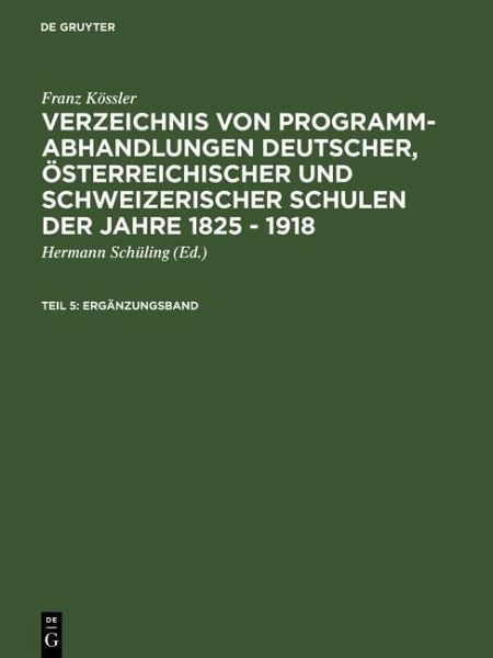 Mit diesem vorliegenden Ergänzungsband beendet Franz Kössler seine Arbeit an dem Verzeichnis der Schulprogramme und hofft, dem interessierten Benutzer eine brauchbare Arbeitsgrundlage zu geben. Dieser Ergänzungsband ist das Ergebnis seiner Suche in verschiedenen Bibliotheken, die ihre Bestände an Schulprogrammen haben einsehen lassen. Zur Vervollständigung älterer Schulprogramme hat er auch das "Lexikon der vom Jahr 1750 bis 1800 verstorbenen teutschen Schriftsteller" von J . G. Meusel durchgesehen. (Ausgabe Nachdr. Olms, Hildesheim 1967.) Bd 1-15.