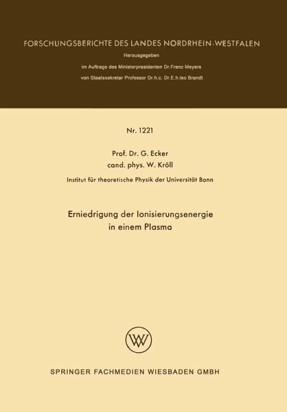 Abstract.- Konzept.- A. Verallgemeinerte Ionisationsformel und Definition der Erniedrigung der Ionisierungsenergie für ein Plasma im thermodynamischen Gleichgewicht.- B. Berechnung der Erniedrigung der Ionisierungsenergie für ein Plasma im thermodynamischen Gleichgewicht.- C. Vergleich mit früheren theoretischen Untersuchungen.- D. Experimentelle Befunde zur Erniedrigung des Ionisierungspotentials.