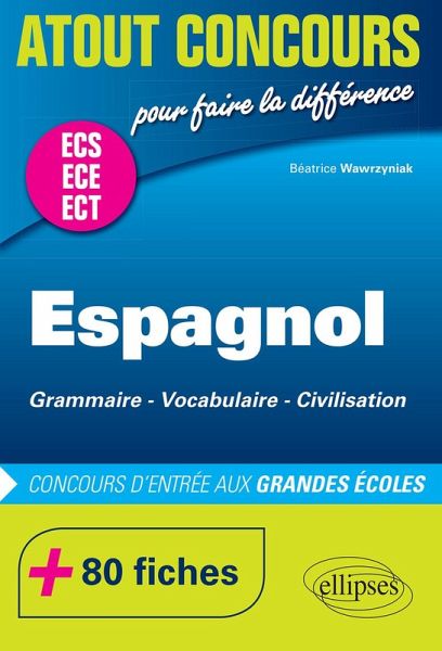Destiné aux candidats préparant les concours d'entrée des Écoles de Management, Atout Concours offre une synthèse par discipline. Véritables outils de révisions et de repères, les ouvrages sont construits autour de fiches thématiques mettant en perspective enjeux, concepts et fondamentaux du programme. Autant d'atouts décisifs pour une réussite optimale. L'ouvrage met l'accent sur les thèmes développés aux concours, et optimise vos révisions pour être synthétique et faire la différence le jour de l'examen : . Il cible les principales difficultés de la grammaire espagnole . Il propose le vocabulaire utile pour s'exprimer de manière authentique et naturelle . Il regroupe des fiches de civilisation balayant les principaux sujets d'actualité