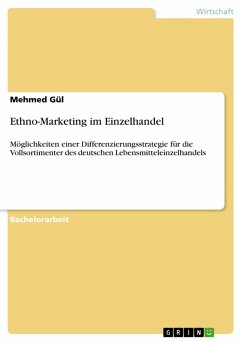 Bachelorarbeit aus dem Jahr 2013 im Fachbereich BWL - Offline-Marketing und Online-Marketing, Note: 1,7, Fachhochschule Düsseldorf, Sprache: Deutsch, Abstract: Die vorliegende Arbeit beschäftigt sich mit den Chancen und Risiken des Ethno-Marketings. Dabei handelt es sich um eine Marketingstrategie, die gezielt auf bestimmte ethnische Gruppen zugeschnitten ist. In der Arbeit selbst wird der Begriff "Ethno-Marketing" zunächst definiert und im Anschluss die Entwicklung des Konzepts in Deutschland dargestellt. Zusätzlich werden Ziele und Strategien dieser Marketingvariante beschrieben. In einer Überblicksdarstellung des deutschen Einzelhandels werden die Vollsortimenter sowie der türkische Lebensmitteleinzelhandel abgegrenzt. Neben der Behandlung der Wettbewerbsstrategien, die den Handelsunternehmen zur Marktbearbeitung zur Verfügung stehen, wird auf die Instrumente des Handelsmarketings eingegangen. Anschließend beschäftigt sich die Arbeit intensiv mit der Bevölkerungs- und Sozialstruktur der Türken in Deutschland und deren Konsumentenverhalten. Zu diesem Zweck zieht der Autor die kulturellen und religiösen Determinanten für die Einkaufsstättenwahl im Lebensmitteleinzelhandel zur Untersuchung heran. Als Abschluss der Arbeit wird ein Gestaltungsansatz des Ethno-Marketings entwickelt und es werden erste Überlegungen angestellt, wie die Ethno-Markenpolitik bei Vollsortimentern des Lebensmitteleinzelhandels angewandt werden kann.