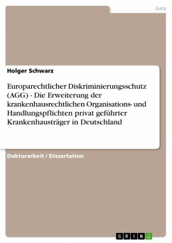 Doktorarbeit / Dissertation aus dem Jahr 2009 im Fachbereich Jura - Europarecht, Völkerrecht, Internationales Privatrecht, Note: 1 (magna cum laude), UMIT Private Universität für Gesundheitswissenschaften, Medizinische Informatik und Technik (Institut für Human- und Wirtschaftswissenschaften), Sprache: Deutsch, Abstract: Die Dissertation beschäftigt sich mit den Organisationspflichten des: - § 12 Abs. 1 AGG (Präventive Schutzmaßnahmen) - § 12 Abs. 2 AGG (Schulungsmaßnahmen) - § 12 Abs. 3 AGG (Reaktive Maßnahmen) - § 13 Abs. 1 AGG (Einrichtung der Beschwerdestelle) jeweils unter Berücksichtung der Rechte des Betriebsrates. Die unbestimmten Rechtsbegriffe der o.a. Normen werden konkretisiert. Das Allgemeine Gleichbehandlungsgesetz legt den Krankenhausträgern in den §§ 12 und 13 AGG seit dem 18.08.2006 bis dahin unbekannte Organisationspflichten auf, lässt die Krankenhausträger durch zahlreiche unbestimmte Rechtsbegriffe im Unklaren darüber, welche Rechtspflichten er in welcher Art und Weise zu erfüllen hat. Die Dissertation verfolgt das Ziel, die einschlägigen Rechtsnormen des AGG zu Operationalisieren und die Normenkomplexe des AGG in die Praxis zu integrieren und damit das Risiko juristischer Haftung für den Krankenhausträger zu minimieren. Diese Dissertation geht ausschließlich auf privat geführte Rechtsträger von Krankenhäusern und vor diesem Hintergrund ausschließlich auf die Rechte des Betriebsrats aus dem BetrVG ein. Die Rechte des Personalrats aus dem Personalvertretungsgesetz für öffentliche Rechtsträger von Krankenhäusern werden nicht betrachtet.