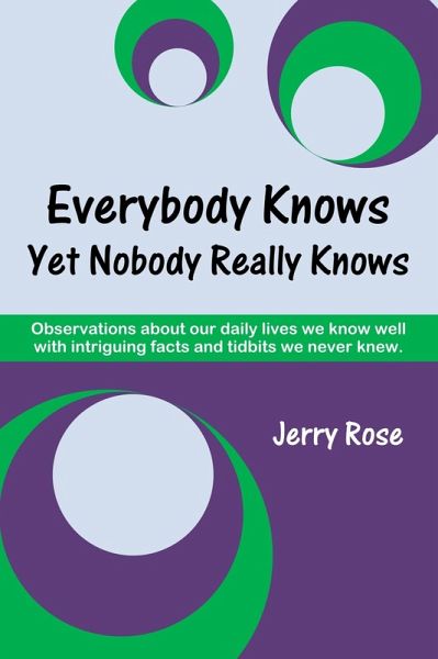 This book provides a succinct commentary on our daily lives. Each page introduces an observation that, for most readers, will bring back memories from their own life. It provides a fun look at things we are very familiar and think we know a lot about. The book acknowledges this knowledge in the first part of the title "Everybody Knows." It then goes on to add a series of thoughts and points we most likely did not know. Sometimes this comes in the form of a new twist or thought. Other times it comes in the form of obscure, but interesting new facts on the topic, or maybe intriguing points from a survey. Hence, the book carries the conflicting second part of the title "Yet Nobody Really Knows." Now we can laugh and smile at what we knew while we think about a new twist on this and then enjoy collecting new tidbits of knowledge we never knew. This will provide a rich collection of thoughts sprinkled with new intriguing facts and tidbits we can't wait to share with our friends. So how is this accomplished? The thought of each page is presented in a simple four to six line poem where each line rhymes. This is done as a fun way to introduce the thought and encourage reflection on the topic at the same time. A short afterthought follows enhancing the thought. Even though these thoughts are about common experiences, they frequently carry unusual insight. The second half of each page contains a series of interesting facts, quotes, survey results, or maybe a short story providing commentary on the thought. Here many new and interesting points are shared. Over 500 online references are provided allowing additional reading on many of these new and interesting points. The book looks at a wide range of thoughts from personal and family topics, to school and work, and those we find as we travel out and about in the world. The book closes by spending some time on some specific character traits that will uplift and inspire.