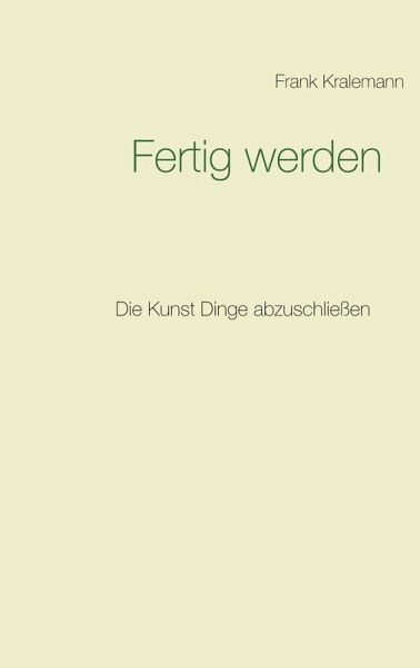 In diesem Buch geht es um Fertig werden. Die vielen Dinge die man im Kopf hat abschließen. Klarheit schaffen und Platz für neue Projekte. Durch die vielen offenen Enden, die man im Kopf hat, ist man blockiert und verbraucht Energie, ohne weiter zu kommen. Leben muss gestaltet werden, dieses Buch soll Ihnen dabei helfen ihre Ziele zu verwirklichen.