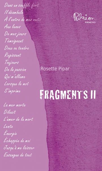 "Fragments II" est la suite du premier recueil de poèmes "Fragments I". Il a pour principale l'écrit, personnifiant la vie intérieure qui vibre en duo. Il se fait l'écho de la voie profonde captant le souffle brut qui quête sa parcelle d'existence. Chemin faisant, il témoigne de l'amour et des sentiment qu'il capte au détour des relations entre les êtres humains. Réflexion ou cri du coeur, il se fait chair. À PROPOS DE L'AUTRICE Très jeune, Rosette Pipar affiche un tempérament d'artiste attirée par de multiples disciplines comme le dessin, la danse, l'écriture. Elle signe ses premiers poèmes dès l'âge de 15 ans dans un élan destiné à cristalliser l'émotion. Elle obtient un Baccalauréat ès Arts à l'Université de Montréal au terme d'études en littérature, histoire de l'art, communications, marketing et journalisme. Femme d'affaires dynamique et impliquée socialement, elle organise des évènements majeurs et est consultante en communications auprès d'entreprises qui remportent des prix d'excellence. En parallèle, elle gère la carrière d'artistes peintres et préside des organismes culturels. Elle conçoit de nombreux projets pilote dont « Horizons artistiques » destiné aux jeunes ayant abandonné l'école et « Arts et affaires » pour des artistes professionnels. Elle anime également une série d'émissions télévisées artistiques et signe trois biographies d'artistes peintres dont Umberto Bruni et Littorio Del Signore, un essai intimiste "Désir d'écrire" et un recueil de poésie "Fragments" chez Marcel Broquet. Elle est également éditrice.