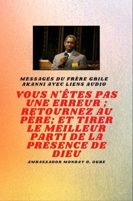 Messages du frère Gbile Akanni avec liens audio : Vous n'êtes pas une erreur , Retournez au Père et Profiter pleinement de la présence de Dieu est un recueil de trois messages fondamentaux et réconfortants du frère Gbile Akanni, prédicateur biblique nigérian itinérant, reconnu pour sa capacité à transformer les croyants en disciples. Dans Vous n'êtes pas une erreur , il apporte la guérison aux coeurs blessés, démontrant à partir des Écritures qu'aucune vie n'est le fruit du hasard et que Dieu peut racheter les origines, la naissance et les épreuves pour accomplir son dessein. Dans Retournez au Père , tiré de Luc 15, il invite à revenir le fils prodigue, celui qui s'est éloigné de la foi, et même le fils aîné qui, bien que resté à l'église, s'est refroidi, montrant ainsi que le renouveau spirituel commence par un retour à l'amour du Père. Dans Profiter pleinement de la présence de Dieu , il enseigne comment demeurer en Dieu, et non pas seulement le visiter ; comment rester là où Dieu agit afin que sa grâce, sa fraîcheur et sa puissance ne s'estompent pas après quelques jours.