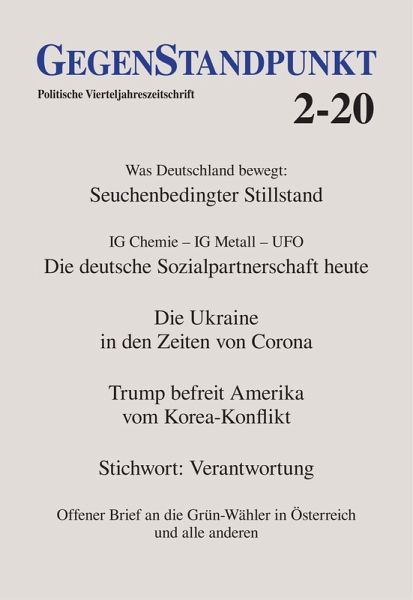 Das hatte niemand kommen sehen: Ein ziemlich ausländisches und ziemlich tödliches Virus breitet sich gegen jede marktwirtschaftliche Vernunft und gegen jedes Erfordernis der deutschen Konkurrenzposition am Standort D aus und veranlasst die Obrigkeit zu einem Shutdown. Der sorgt für einen Wirtschaftseinbruch, der alles übertrifft, was das an periodische Wirtschaftseinbrüche gewöhnte, insofern abgebrühte kollektive Gedächtnis aus den letzten 100 Jahren so gespeichert hat. Die öffentliche Meinung reagiert gespalten zwischen ¿Muss sein!¿ und ¿Geht gar nicht!¿. Dieser Dissens lebt von einem durchs Virus offensichtlich nicht angekränkelten Konsens: Weil die seuchenpolitische Ausnahmesituation für die meisten ungemütlich, für viele unerträglich und für nicht wenige existenziell unaushaltbar ist, soll der seuchenfreie Normalzustand wieder her ¿ unbedingt und so schnell, aber auch so endgültig wie möglich. Immun ist dieses Lob der Normalität gegen jeden Gedanken, dass die vermisste Normalität dafür sorgt, dass ein paar Wochen gedämpfter Betriebsamkeit zu einem ökonomischen Desaster werden. Obwohl bekannt ist, dass schon der Normalzustand mit seinen nun vermissten Freiheiten für die meisten vor allem in der Mühsal von werktätigem Gelderwerb und Geldeinteilen besteht. Darum gibt es in GegenStandpunkt 2-20 erstens eine Artikelserie zur Pandemie, die entgegen der Propaganda gemeinsamer Betroffenheit von ¿Coronä die Gegensätze, die Widersprüche und auch das unübersehbare Moment von Gewalt der politischen Seuchenbekämpfung erklärt: dass und wie die sich der Logik der kapitalistischen Normalität und ihrer über jeden Zweifel erhabenen Selbstverständlichkeiten verdanken; und dass und wie auch die Dummheit der verbreiteten anti-seuchenpolitischen Kritik sich halbwegs im Rahmen des demokratisch Üblichen bewegt. Darum gibt es zweitens eine Artikelreihe über den Stand der Auseinandersetzungen, die die Gewerkschaften ganz ohne Krankheit & Krise offensichtlich immerzu gegen das Kapital führen müssen, damit ihre Leute im gewöhnlichen Getriebe überhaupt zurechtkommen mit Lohn und Leistung. Das gehört nämlich nicht zu den Selbstverständlichkeiten marktwirtschaftlicher Normalität, ist darum immerzu Gegenstand des Kampfes ¿ und es ist darum umso verrückter, dass Deutschlands große Industriegewerkschaften den vom Standpunkt schwarz-rot-goldener Sozialpartnerschaft führen. Dass sich an ¿Coronä auch die Nationen der Welt gründlich scheiden, ist ebenfalls bekannt; und auch, dass das irgendwie damit zu tun hat, wie die sowieso dastehen. Im Artikel über die Ukraine wird erklärt, was die Karriere dieses Landes zum gigantischen ¿failed state` mit den Bemühungen zu tun hat, es zum kapitalistisch wirtschaftenden antirussischen Frontstaat zu machen ¿ und warum die Folgen der Pandemie so katastrophal ausfallen, wie der Zustand des ganzen Landes längst ist. Außerdem in GegenStandpunkt 2-20: Ein Artikel über Trumps imperialistische Friedenspolitik gegenüber dem altgedienten Feind Nordkorea, deren Fortschritte und Widersprüche beweisen, wie konsequent und seriös der schlecht beleumundete US-Präsident die Revision der eingerichteten imperialistischen Weltordnung betreibt; eine Kritik der obrigkeitlichen Belehrungen des deutschen Volkes darüber, warum sich fremdenfeindlicher Terror für ein gutes Volk nicht gehört; ein Brief an die ¿ insbesondere grünen ¿ Wähler in Österreich über die Fehler des Wählens und deren staatstragende Leistung; eine Korrespondenz zur Kritik der politischen Ökonomie des Grundeigentums.