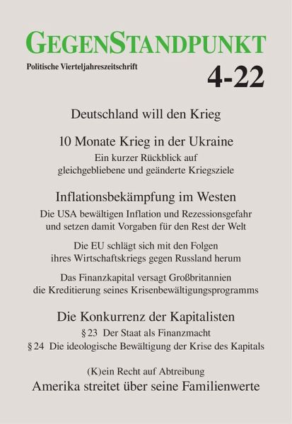Deutschland will den Krieg ¿ Oder wie soll man das sonst verstehen, wenn täglich von Mitgliedern der regierenden Koalition der Krieg in der Ukraine zu unserer, also Deutschlands Sache erklärt wird? Wenn zu jeder Gelegenheit die Entsendung von mehr und schwereren Waffen aus Deutschland in die Ukraine gefordert wird und das auch in steigendem Umfang stattfindet? Wenn es regierungsamtliche Linie ist, die Ukraine in ihrer Kriegsführung dauerhaft zu unterstützen, solange sie das braucht? Bleibt gleichwohl die Frage: Warum? Wozu? Welchen nationalen Zweck, welche Staatsräson verfolgt Deutschland mit dem Krieg, den es will? 10 Monate Krieg in der Ukraine: Ein kurzer Rückblick auf gleichgebliebene und geänderte Kriegsziele Nochmal zurück auf Los: Russland führt eine ¿militärische Spezialoperation¿ mit Ziel Kiew und im Osten der Ukraine durch mit dem erklärten Ziel, die dem Westen ¿ der EU und der NATO ¿ willfährige Regierung zu entmachten und durch eine russlandfreundliche zu ersetzen; die Okkupation von Gebieten, die an die Moskau treuen Volksrepubliken im Osten des Landes angrenzen, soll die gegen permanente Über- und Angriffe ukrainischer Kräfte schützen und die Annexion der Krim militärisch absichern. Als sein sehr viel weiter gestecktes strategisches Ziel deklariert Russland zugleich die Sicherung seines eigenen Bestandes gegen das Vorrücken des westlichen Kriegsbündnisses an seine Westgrenze; die Vereinnahmung des Nachbarn am Schwarzen Meer durch NATO und EU als antirussischer Vorposten, womöglich auch für die Stationierung amerikanischer Mittelstreckenraketen, wird als fundamentale Bedrohung der eigenen strategischen Abwehrfähigkeit eingeschätzt ¿ eine Bedrohung, die zurückgewiesen werden muss. Die USA bewältigen Inflation und Rezessionsgefahr und setzen damit Vorgaben für den Rest der Welt In den USA steigen schon seit längerem auf breiter Front die Preise. Der Wertverfall des nationalen Zahlungsmittels beschädigt dessen verlässliche Dienste für Wirtschaft und Gesellschaft: Er greift die Kaufkraft von Löhnen und Gehältern an, mit denen sich Durchschnittsamerikaner ihren Lebensunterhalt finanzieren, und droht damit den Lebensstandard infrage zu stellen, auf den der hard-working American anerkanntermaßen ein Recht hat; und er unterminiert die Verlässlichkeit, mit der das Geld die Leistung erbringt, als Mittel der Kapitalvermehrung für Unternehmen und Finanzinstitute zu dienen. Beides will die amerikanische Staatsmacht nicht einfach gelten lassen. Die EU schlägt sich mit den Folgen ihres Wirtschaftskriegs gegen Russland herum Im September 2022 sieht sich die EZB als Hüterin des Euro genötigt, die amerikanische Zinswende nachzuvollziehen. Die Konkurrenz der Kapitalisten §23 Der Staat als Finanzmacht ¿ §24 Die ideologische Bewältigung der Krise des Kapitals ¿Die Konkurrenz ist überhaupt die Weise, worin das Kapital seine Produktionsweise durchsetzt.¿ (Karl Marx) Im Anschluss an die Ableitung des Kapitals, des bürgerlichen Staates, des modernen Imperialismus sowie der Errungenschaften des Finanzgewerbes und des Weltmarkts geht es darum, systematisch darzulegen, welche Notwendigkeiten die Akteure einer Welt ins Werk setzen, in der ¿Konkurrenz herrscht¿, und gemäß welcher eigenen Logik sie das tun. Die Ableitung der die Welt beherrschenden Produktionsweise aus dem Beruf eigennütziger kapitalistischer Bereicherung ist unterteilt in 5 Kapitel à 6 Paragraphen.