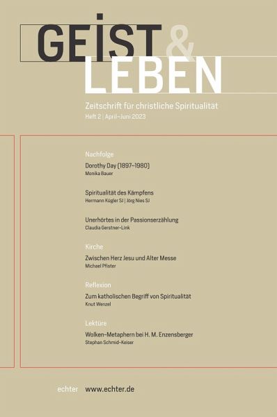 GuL 96 (2023), Heft 2 April-Juni 2023 n. 507 Notiz Margarete Gruber OSF Synodale Wege [113-114] Nachfolge Monika Bauer "Menschen sind die Worte Gottes". Die Journalistin, Sozialaktivistin und Mystikerin Dorothy Day [116-124] Hermann Kügler SJ / Jörg Nies SJ Spiritualität des Kämpfens - Potential und Grenzen. Eine jesuitische Perspektive [125-133] Claudia Gerstner-Link Trost inmitten von Abgründen. Unerhörtes in der Passionserzählung [134-141] Nachfolge Kirche Elmar Mitterstieler SJ Das Evangelium der Maria von Magdala. Vollendung der Offenbarung [142-145] Michael Pfister Zwischen Herz Jesu und Alter Messe. Zur Attraktivität frommer Praktiken des 19. Jahrhunderts [146-153] Eckhard Bieger SJ Nach dem Gestellungsvertrag. Gedanken zum Seniorat [154-159] Nachfolge Junge Theologie Daniel Klinkmann Die rituelle Welt des Lukas. Gebet und Mahl als Vorbild für Christ(inn)en heute [160-164] Reflexion Knut Wenzel "Atme in mir". Überlegungen zum katholischen Begriff von Spiritualität [166-174] Richard Atchadé Der Schock der Endlichkeit. Paul Tillich zum Verhältnis von Sein und Nichtsein [175-182] Raphaela Brüggenthies OSB Kraft der Erinnerung. Über eine lebensdienliche Ressource [183-192] Lektüre Stephan Schmid-Keiser Frömmigkeit an der Grenze des Sagbaren. Zur Wolken-Metapher bei Hans Magnus Enzensberger [194-201] Marius Schwemmer Theopoesie in Zeiten der Bedrängnis. Zwei moderne Lesearten von Psalm 130 [202-210] Hans Brandl SJ "Wohin, Herr, willst du mich bringen?" Zur Dissertation von Hernán Rojas [211-214] Buchbesprechungen [215-220]