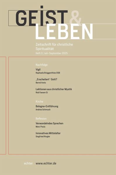 GuL 98 (2025), Heft 3 Juli-September 2025 n. 516 Notiz Christoph Benke Wenn der Boden schwankt [223-224] Nachfolge Raphaela Brüggenthies OSB Vigil [226-230] Michael Höffner Sakrament des gegenwärtigen Augenblicks. "Caussades" Alltagsmystik in theologischer Relecture II [231-238] Ulrich Hörwick Auf der Spur des homo religiosus. Zur spirituellen Verortung von Bergexerzitien [239-247] Bernd Aretz "Erscheitert" Gott? Kenosis und Kunst bei Klaus Hemmerle [248-256] Rob Faesen SJ Lektionen aus christlicher Mystik [257-265] Nachfolge Kirche Andrea Schmuck Die Bologna-Entführung. Ein Krimi über Vertrauen als dialogische Ressource [266-272] Daniel Tibi OSB Kanonische Weisheit. Von der Spiritualität des Kirchenrechts [273-281] Nachfolge Junge Theologie Wolfgang Sigler OSB Der Exodus als Streitgeschichte [282-287] Reflexion Christoph J. Amor "Alles ist durch das Wort geworden". Zugänge zur Lehre von der Schöpfungsmittlerschaft [288-296] Marc Pauly Verwandelndes Sprechen. Sprache als geistlicher Weg bei Eugen Rosenstock-Huessy [297-306] Siegfried Ringler Innovatives Mittelalter [307-315] Philippe Lécrivain SJ Geschichte und Theologie treiben mit Michel de Certeau (1925-1986) [316-322] Lektüre Buchbesprechungen [324-330]