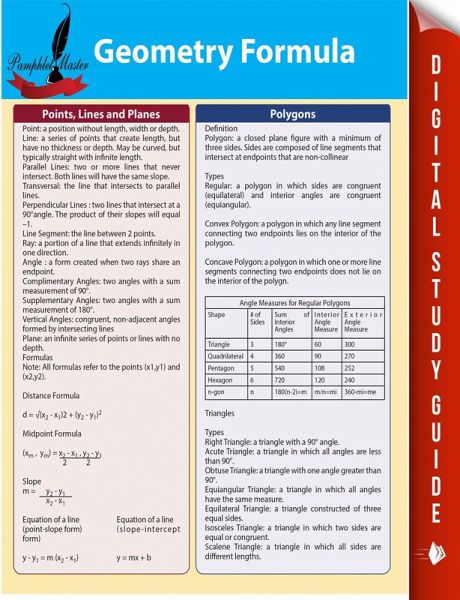 This Geometry Formula study guide is created by Pamphlet Master for students everywhere. This tool has a comprehensive variety of college and graduate school topics/subjects which can give you what it takes to achieve success not only in school but beyond. Included in the pamphlet are: - Points, Lines and Planes - Polygons - Triangles - Inequality of Triangles - Polyhedron - Right Triangles - Transformations - Quadrilaterals - Circles - Angle and Arc Relationships