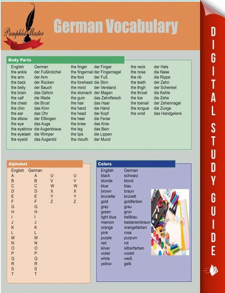 Pamphlet Master's German vocabulary has vocabulary essentials for travelers, students and professionals. This guide has the English translation for every vocabulary word and it is user-friendly for readers to easily understand it. Included in the pamphlet are: - Body Parts - Alphabet - Colors - Animals - Numbers - Technology - At The Mall - Family - At The Store - At The Beach - At The Party - Furniture - Time and Seasons - Months and Days - Bank and Finance - Vehicles - Nature -Weather and Natural Disasters - Travel - Vehicles