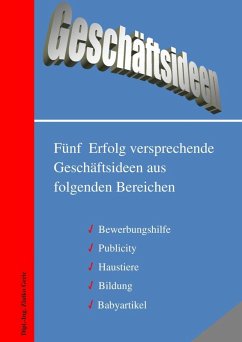 In diesem E-Book möchte ich Ihnen fünf Erfolg versprechende Geschäftsideen aus verschiedenen Lebensbereichen präsentieren, die ein hohes Potenzial haben und die bei Realisierung äußerst gewinnbringend sein können. Dabei werden wichtige Faktoren wie Marktnische, Lösung, Kapitalbedarf und Umsatzplanung näher ergründet und praxisorientiert dargestellt. Was noch fehlt, ist Ihr persönlicher Einsatz mit Mut, Kreativität, Durchhaltevermögen und die richtige Strategie. Lassen Sie sich durch die eine oder andere Geschäftsidee aus diesem Buch inspirieren und wagen Sie etwas Neues - vielleicht entdecken Sie die größte Chance Ihres Lebens. Die fünf besten Geschäftsideen für Ihren Erfolg: » Geschäftsidee 1: Bewerbungshilfe Ein Bewerber muss sich heutzutage von der breiten Masse positiv abheben, um seine Erfolgsaussichten auf einen Job zu erhöhen. Bieten Sie ihm Ihre Unterstützung an, die sich in anderen fortschrittlichen Industrienationen schon längst bewährt hat. » Geschäftsidee 2: Publicity Menschen mit Geltungsbedürfnis oder begeisterte Sportfans nutzen jede Möglichkeit, um ihre Präsenz in der Öffentlichkeit zu zeigen. Das Geld liegt sprichwörtlich auf der Straße, Sie müssen es nur aufheben. » Geschäftsidee 3: Haustiere Es gibt immer mehr Haushalte mit Tieren, hier speziell mit Hunden, die durch steigenden Wohlstand die Mittel haben, ihre Vierbeiner außergewöhnlich belohnen zu wollen. Realisieren Sie diese unglaubliche noch unentdeckte Nische und sichern Sie sich Platz 1 unter den Newcomern. » Geschäftsidee 4: Bildung Im fortgeschrittenen Computerzeitalter ist es nicht mehr zeitgemäß, den teuren Nachhilfeunterricht nach konventionellen Methoden zu erteilen. Die dafür steigenden Ausgaben sollen auch für Kinder aus ärmeren Verhältnissen bezahlbar bleiben. Wie das geht, zeigt Ihnen meine Geschäftsidee. » Geschäftsidee 5: Babyartikel Der Babymarkt boomt und Sie können von diesem Trend ganz einfach profitieren. Wenn man die gestressten Eltern dabei noch entlasten kann, dann haben Sie eine interessante und lukrative Nische gefunden. Weitere Beschreibung der Geschäftsidee mit Umsatzplanung finden Sie hier im Kapitel fünf. Bitte denken Sie daran: Jede Geschäftsidee kann durch Weiterentwicklung und Verbesserung noch lukrativer sein als die bestehende Idee - Vorsprung durch eigene Kreativität.