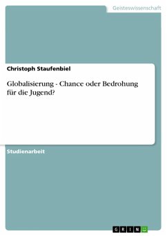 Studienarbeit aus dem Jahr 2011 im Fachbereich Soziologie - Arbeit, Ausbildung, Organisation, Note: 1,0, Universität Potsdam, Sprache: Deutsch, Abstract: Um auf die Ausgangsthese einzugehen, ob Globalisierung für die Jugend als Chance oder Bedrohung gesehen werden kann, sollte man das Thema aus zwei Blickwinkeln betrachten. Zwar eröffnet Globalisierung für Jugendliche neue Möglichkeiten und Chancen, diese sind jedoch mit Risiken verbunden. Die Ausbildung in verschiedenen Berufszweigen floriert und bietet somit neue Möglichkeiten. Das Betreiben eines internationalen Handels wurde möglich, auch der gesellschaftliche Wohlstand konnte gemehrt werden. Und banale heutzutage für uns alltägliche Dinge wie ganzjährig frisches Obst zu essen, billige Waren einzukaufen wurden erst durch die Globalisierung ermöglicht. Auch das bereisen der ganzen Welt wurde erst dadurch möglich sowie die internationale Kommunikation. Trotz den Vorteilen sind die Chancen der Globalisierung allerdings mit Risiken verbunden.