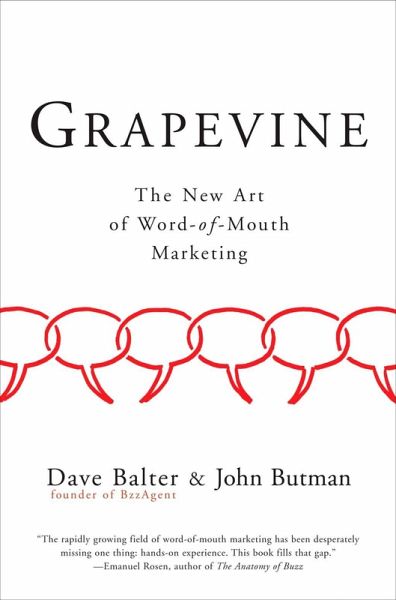 Word of mouth is an amazingly powerful force but how does it really work?. Businesses have become obsessed with stimulating word-of- mouth to counteract the declining effectiveness of advertising. But it's easier said than done. As the founder of BzzAgent, a community of more than 400,000 people who volunteer to talk to friends and acquaintances about products they genuinely love, Dave Balter is a successful practitioner, not a theorist. And he's figured out how to measure and harness word-of-mouth without corrupting it. In Grapevine, Balter shows why honest feedback about books, restaurants, gadgets, or anything else is more believable than any paid endorser. And he answers some of the most elusive questions in marketing, such as what makes word-of-mouth very different from buzz and viral marketing.