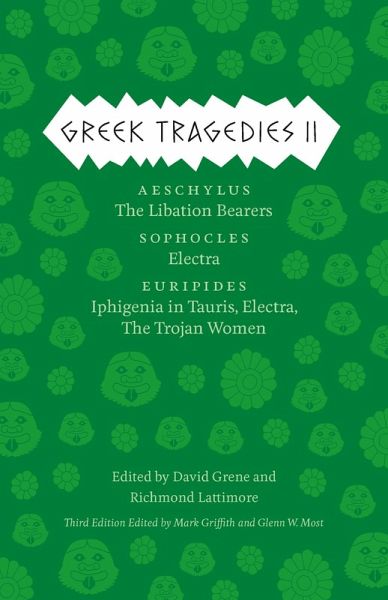 Greek Tragedies, Volume II contains Aeschylus's "The Libation Bearers," translated by Richmond Lattimore; Sophocles's "Electra," translated by David Grene; Euripides's "Iphigenia among the Taurians," translated by Anne Carson; Euripides's "Electra," translated by Emily Townsend Vermeule; and Euripides's "The Trojan Women," translated by Richmond Lattimore.