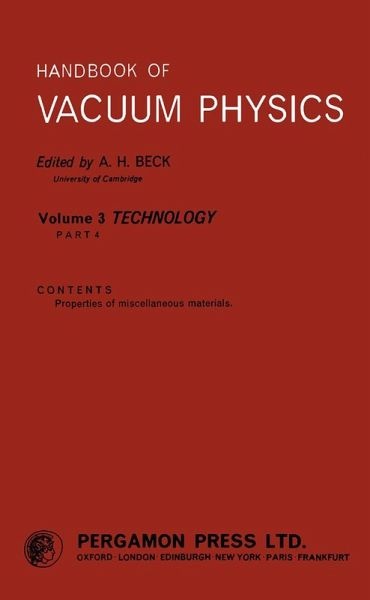 Handbook of Vacuum Physics, Volume 3: Technology is a handbook of vacuum physics, with emphasis on the properties of miscellaneous materials such as mica, oils, greases, waxes, and rubber. Accurate modern tables of physical constants, properties of materials, laboratory techniques, and properties of commercial pumps, gauges, and leak detectors are presented. This volume is comprised of 12 chapters and begins with a discussion on pump oils, divided into rotary pump oils and vapor pump oils. The next chapter deals with the properties and applications of greases, including outgassing and vapor pressures, plug cocks, and rotary and reciprocating transmissions. The uses and general properties of waxes are also considered, along with those of adhesives, film coatings or impregnants, lubricants, and plastics. The remaining chapters focus on elastomers (rubbers), O-rings and other gaskets, mica, and cleaning fluids. The final chapter describes other miscellaneous materials such as desiccants and molecular sieves, with particular reference to activated charcoal, phosphorus pentoxide, silica gel, synthetic zeolites, and activated alumina. This book will be a useful resource for students in engineering or physics.