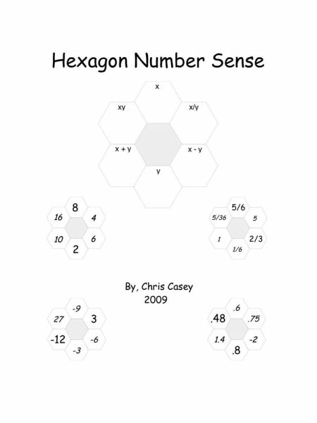 Understanding how numbers go together and come apart, how number operations are related to each other: number sense, is key to students' comprehension of higher levels of mathematics. Using these materials will help students see the interconnectedness of numbers, as well as giving them practice manipulating numbers. For each hexagon, any two numbers can be given, and the other numbers can be found. The simplest case is to give the x and y number and then students follow the operations (see thumbnail for examples). However, this can become more difficult if only x or y is given, plus one other hexagon. The most difficult case is giving any two hexagons except x or y. In addition, the hexagon can be used for whole numbers, integers, decimals, fractions, and even algebra. These materials can be used from third grade through middle school, depending on the level of difficulty and the type of numbers involved. There is consistency throughout though because any relationships between the hexagons exist for all levels and all types of numbers. You can use these as homework dittos, classroom activities, or a one a day warm up problem on the board or overhead.