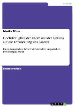 Bachelorarbeit aus dem Jahr 2017 im Fachbereich Gesundheit - Gesundheitswissenschaften - Gesundheitspsychologie, Note: 2,6, FernUniversität Hagen (Institut für Psychologie), Veranstaltung: Entwicklungspsychologie, Sprache: Deutsch, Abstract: Das Ziel dieser Bachelorarbeit besteht darin, einen aktuellen Überblick über zentrale Erkenntnisse zum Zusammenhang zwischen Hochstrittigkeit und den möglichen Auswirkungen auf den Entwicklungsverlauf von Kindern beziehungsweise Jugendlichen anhand empirischer Forschungsarbeiten mit Hilfe einer systematischen Literaturrecherche zu geben. Der Fokus wurde dabei auf die sensible Phase der Adoleszenz gelegt. Dazu wurden 17 Primärstudien hinzugezogen. Besonders das aufgrund der Hochstrittigkeit veränderte Eltern- beziehungsweise Erziehungsverhalten, aber auch die Involvierung der betroffenen Jugendlichen in den elterlichen Konflikt scheinen gravierende Auswirkungen auf deren mentale Gesundheit und ihr Wohlbefinden zu haben. Die Ergebnisse zeigen, dass besonders im Problemverhalten negative Folgen zu erwarten sind. Aber auch in der sozialen Entwicklung und im schulischen Bereich konnten Effekte festgestellt werden.