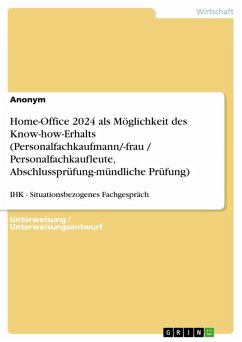 Unterweisung / Unterweisungsentwurf aus dem Jahr 2024 im Fachbereich Führung und Personal, Note: 1,2, , Veranstaltung: Personalfachkaufmann/-frau - Personalfachkaufleute Weiterbildung, Sprache: Deutsch, Abstract: Thema: "Home-Office 2024" als Möglichkeit des Know-how Erhalt Inhalt: - Professionell ausgearbeitete PowerPoint Präsentation (Entwurf); - Fertiges Handout mit Grafiken und Notizblock für den Prüfungsausschuss; - Text für 15 -16 Minuten Präsentationszeit (Sprechtext); - die Grobgliederung zur Präsentation (genehmigt vom Prüfungsausschuss); - Vollständige wissenschaftliche Ausarbeitung - Unterlagen zum Selbststudium / Literatur + Angaben der Quellen (20 Seiten); - Kosten-Nutzen-Analyse. 1. Beschreibung der Ist-Situation; 2. Zielsetzung des Home-Office; 3. Vorteile des Home-Office für das Unternehmen; 4. Vorteile des Home-Office für die Mitarbeiter; 5. Risiken und Lösungen; 6. Kosten-Nutzen-Analyse; 7. Fazit. Situationsbeschreibung: Die Belegschaft des Unternehmens besteht in der Mehrzahl aus Mitarbeiterinnen. Der Großteil der weiblichen Belegschaft ist zwischen 25 und 40 Jahre alt. Bisher hat die Inanspruchnahme der Elternzeit und die folgende Reduzierung auf eine Teilzeitbeschäftigung zu einem ausgeprägten Know-how Verlust geführt, der durch einen hohen Aufwand kompensiert werden musste. Zielsetzung / Mein Auftrag: Derzeit werden im Unternehmen aktuell noch keine betrieblichen Maßnahmen zum Erhalt des Know-hows der Mitarbeiterinnen und Mitarbeitern in der Elternzeit umgesetzt. Die Geschäftsleitung der XY GmbH hat mich damit beauftragt, sie dahingehend zu beraten und entgegenwirkende Maßnahmen des Know-how Verlustes in der Elternzeit vorzuschlagen.
