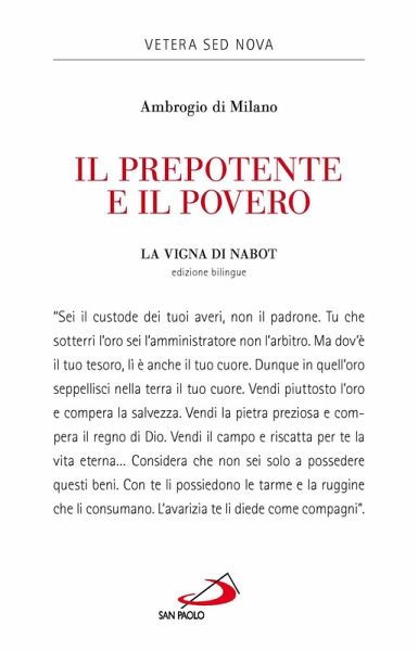 Dai tempi antichi, una lezione per i tempi moderni: «La storia biblica del re Acab, che per confiscare la vigna sulla quale ha messo gli occhi ne fa uccidere il proprietario Nabot, è «antica, ma nell'uso è attuale», commenta Ambrogio all'inizio del suo libro. «Non nacque un solo Acab, ma, quel che è peggio, ogni giorno Acab nasce e in questo mondo giammai muore. Sono sempre più numerosi coloro che accumulano di coloro che lasciano. Non un solo Nabot fu ucciso. Ogni giorno Nabot è umiliato. Ogni giorno è calpestato». Partendo da questo spunto iniziale, Ambrogio denuncia i soprusi dei ricchi e propone un giusto uso della ricchezza: «Non sai, o uomo, come collocare le tue ricchezze? Se vuoi essere ricco sii povero secondo il mondo, affinché tu sia ricco per Dio», ricco di fede, di misericordia, di sincerità, di sapienza, di scienza». Un classico della letteratura cristiana in edizione bilingue.