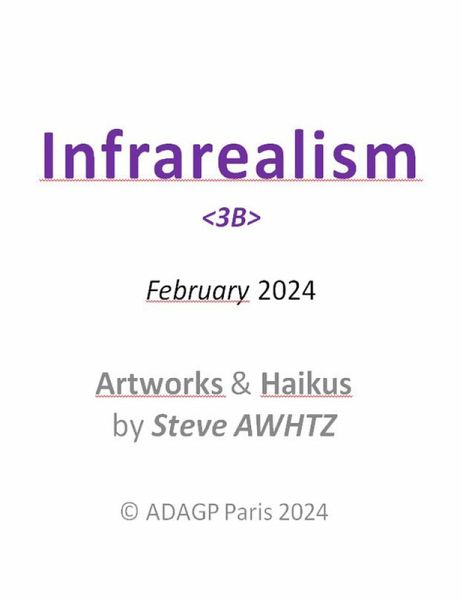 This second edition of the Infrarealism review display the ongoing works on infrarealism, with artworks and haikus. Rather than diging into everlasting art theory, his editor, Steve Awhtz, offers examples of infrarealism on both artworks and haikus. (FR) Ce deuxième numéro de la revue Infraréalisme <3B> présente les travaux en cours sur l'infraréalisme, avec des oeuvres d'art et des haïkus. Plutôt que de creuser dans une éternelle théorie de l'art, son éditeur, Steve Awhtz, propose des exemples d'infraréalisme sur les oeuvres d'art et les haïkus.