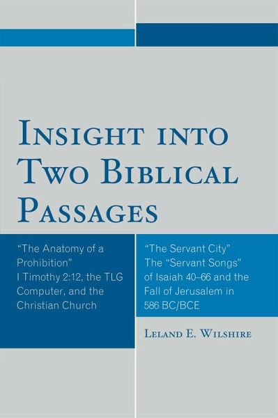 This work comprises new insights into two Biblical passages. The first study, titled 'The Anatomy of a Prohibition,' uses the TLG computer database to offer a new interpretation of I Timothy 2:12. The author provides insight that the TLG computer, with its data selections from 200 BC/BCE to 200 AD/CE, supports the interpretation of one of the key words 'authentein' as 'committing violent action,' not 'having authority.' It then explores the effect of this interpretation on exegesis, gender pronouncements, hermeneutics, tradition, theology, and relevance. As a supplement, it offers a history of traditional translations, mistranslations, and interpretations. The second insight study discusses seeing the 'suffering servant' of Isaiah 40-55 as the city of Jerusalem. This 'Servant City' study is based upon a comparison with the material outside the songs and with other ANE city descriptions that are also in the first millennium.