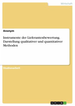 Studienarbeit aus dem Jahr 2014 im Fachbereich BWL - Beschaffung, Produktion, Logistik, Note: 2,0, Hochschule Albstadt-Sigmaringen; Sigmaringen, Sprache: Deutsch, Abstract: In dieser Seminararbeit wird das Ziel verfolgt, wesentliche Aspekte der Lieferantenbewertung darzustellen und auf verschiedene Instrumente einzugehen. Da es hierfür zahlreiche Ansatzpunkte gibt, werden lediglich fünf der gängigsten bzw. bekanntesten Verfahren näher betrachtet. Die Arbeit soll aufzeigen, dass eine erfolgreiche Lieferantenbewertung maßgeblich zum Unternehmenserfolg beiträgt und somit in der betrieblichen Praxis unumgänglich ist. Die Seminararbeit gliedert sich in insgesamt vier Kapitel. Um den Leser an das Thema Lieferantenbewertung heranzuführen, wird in Kapitel zwei zunächst auf Begriffsklärungen und die Einordnung in das Lieferantenmanagement eingegangen sowie die Bedeutung und Ziele der Lieferantenbewertung erläutert. Des Weiteren werden die Anforderungen an die Lieferantenbewertung beschrieben und einige exemplarische Bewertungskriterien aufgeführt. Um der Zielsetzung zu entsprechen, werden im dritten Kapitel verschiedene Instrumente der Lieferantenbewertung dargestellt, die sich in quantitative und qualitative Verfahren gliedern. Hierbei werden neben einem beispielhaften Kennzahlenverfahren und die Preis-Entscheidungsanalyse ebenfalls die Portfolio-Methode sowie Notensysteme erläutert und auf verschiedene Ausprägungen von Punktbewertungsverfahren eingegangen. Diese Instrumente werden anschließend in Kapitel 3.4 kritisch beurteilt. Den Abschluss der Seminararbeit bildet eine zusammenfassende Schlussbetrachtung.