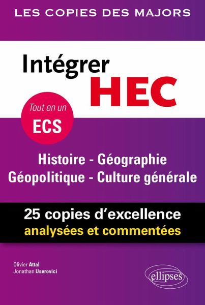Un concours, huit mille candidats, deux ans de préparation, quatre heures pour écrire une dissertation... et quinze minutes pour la noter. Que faut-il écrire le jour J pour majorer les dissertations de Culture Générale et d'Histoire-Géographie? Cet ouvrage vous donne accès à une ressource inestimable : des copies authentiques d'élèves qui ont préparé le concours comme vous, et qui ont obtenu les meilleures notes, de 15/20 à 20/20. - 25 copies authentiques et excellentes du concours, en Culture Générale et en HGG, telles que les candidats les ont écrites - Le plan détaillé de chaque dissertation - L'analyse des points forts de chacune - Les points à améliorer de chacune - Les extraits clés des rapports de jury de chaque épreuve Nouvelle référence dans son domaine, la Collection des Copies des Majors est un incontournable pour tous les élèves de prépa HEC !